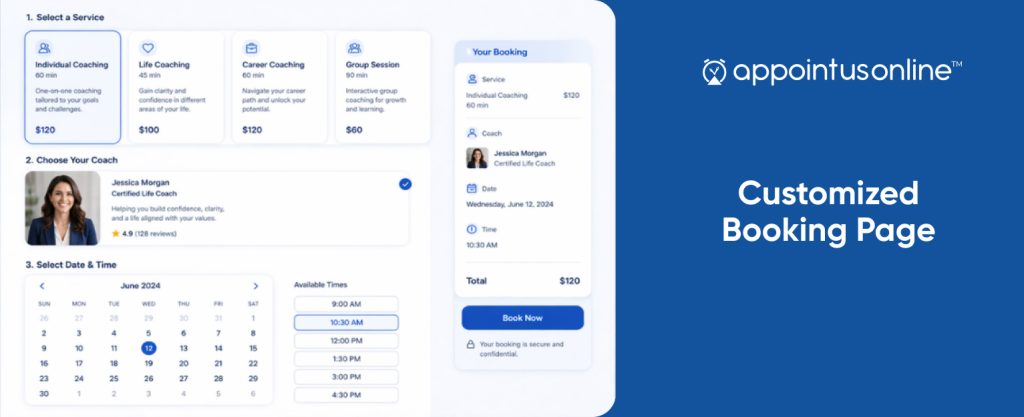 A meeting scheduler gives every provider the same generic link. A personal service booking platform lets you build a booking page that reflects your brand, with your colours, your photo, your service descriptions, and your tone of voice.